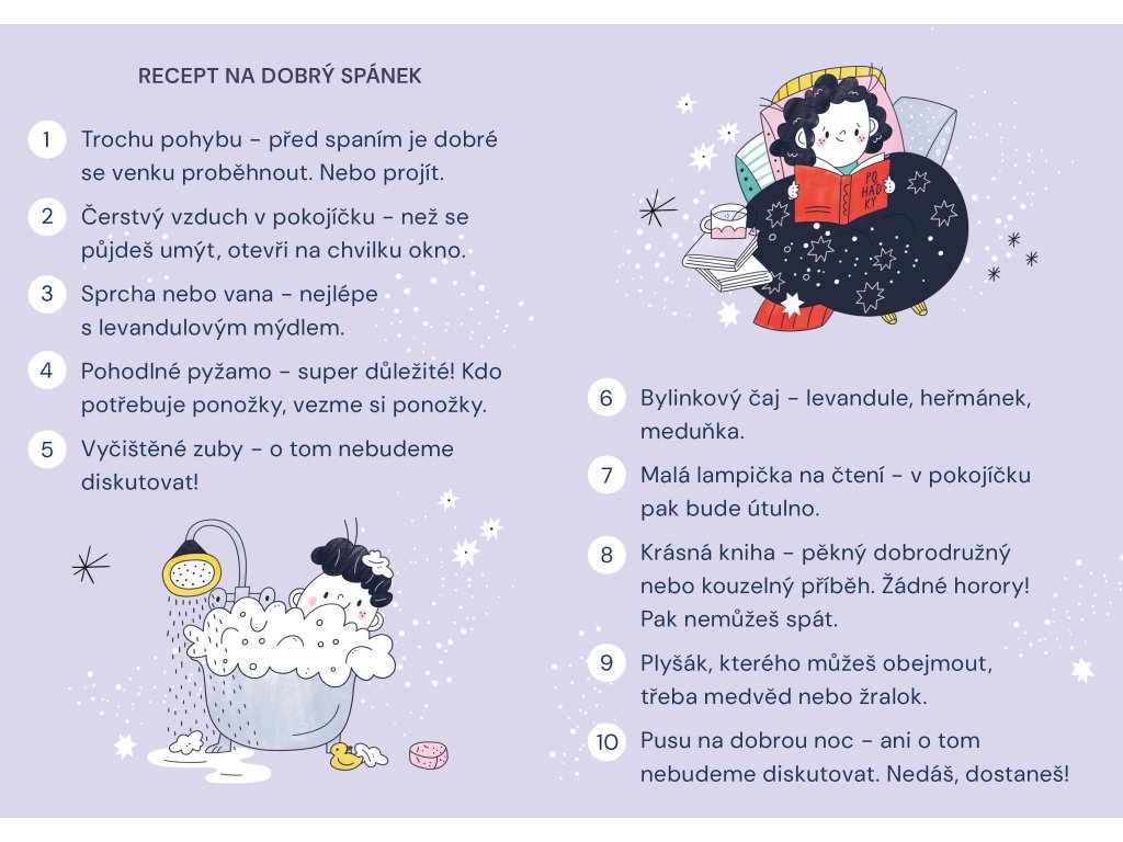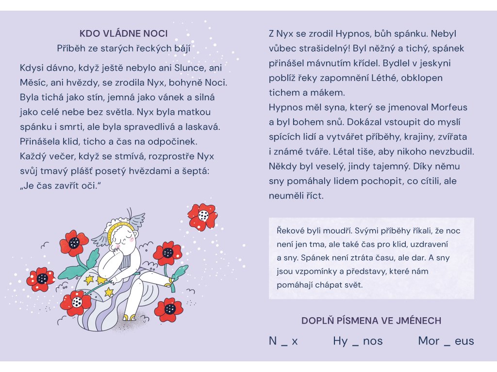 Čemu se říká splněný sen a jaký je recept na dobrý spánek. O čem sní zvířata a jak se jmenuje bůh spánku. Vše o snech, snění a spánku se dočtete v tomto úkolovém sešitu, který vznikl ve spolupráci s projektem Molekuly čtení. Autorky projektu pracují se začínajícími čtenáři a vytváří knížky i podpůrné materiály vycházející z metody úrovňového čtení. Ilustrovala Dita Vopřadová. 20 stran, formát A5