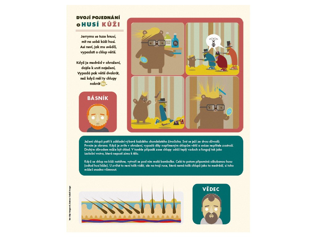 Nová Raketa se věnuje všemu chlupatému od yettiho až po dědečkovy uši. Děti se dozvědí, proč zvířata ježí srst, komu a proč se říká „chlupatí“, ale také kde všude mohou očekávat, že jednou něco vyraší i jim. Dočtou se, kolik má čeština krásných rčení o kůži, peří a srsti, vyrobí si yettiho, zjistí, co je to lanugo, k čemu se hodí lví hříva, a také vypátrají, kdo odcizil vzácné kaktusy. I anglický slovníček bude tentokrát chlupatý, stejně jako pravidelné komiksy. Na výlet se podíváme do Budapešti. Obálku nakreslila Nikola Logosová.