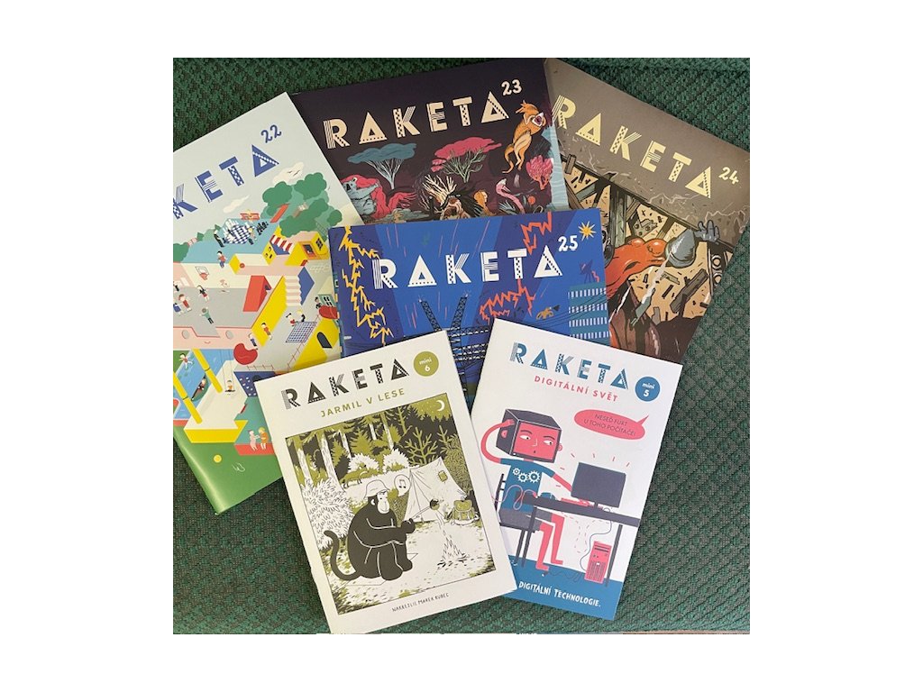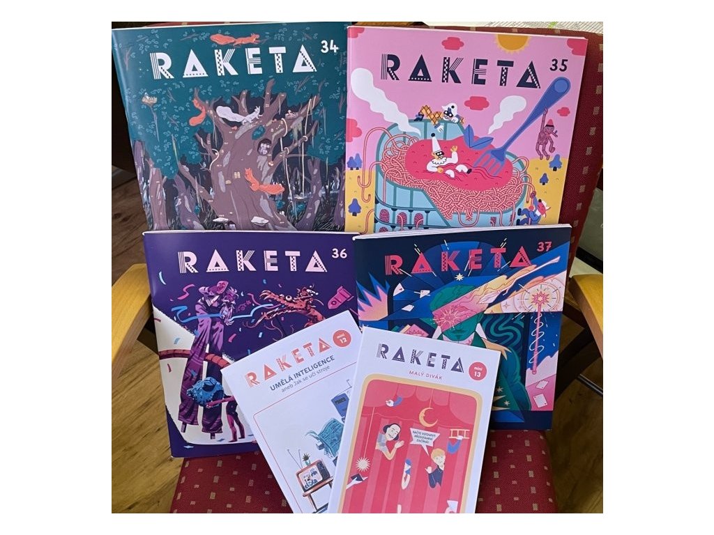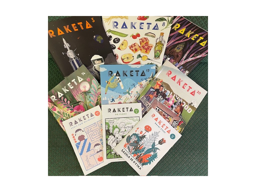 Výběr šesti starších čísel: VESMÍR, JÍDLO, STRAŠIDELNÉ ČÍSLO, BOTANIKA, ZIMNÍ SPORTY, FILM + jako bonus tři sešity Raketa mini: Pro nejmenší, Do vlaku, První čtení